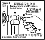 每年至少人工操作一次降溫減壓安全閥,以確保保持正常的工作狀態。為了防止水的破壞,降溫減壓安全閥必須正確連接排泄管,并通過排泄管引導到適當的排污口。站立位置離出水口要有適當的距離(排泄物可能是熱的),緩慢提升并釋放降溫減壓安全閥上的杠桿手柄,使得閥門工作自如,然后重新回到關閉位置。如果閥門無法完全重置并繼續釋放出水來,請立即關閉電源和冷水進水閥,致電擁有資格認證的維修技術人員來維修。