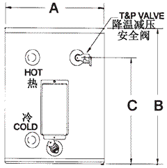 23公升(6加侖)和45公升(12加侖)型號(hào)的水接頭位于熱水器頂部或側(cè)面;72公升(19加侖)型號(hào)只能側(cè)面連接。